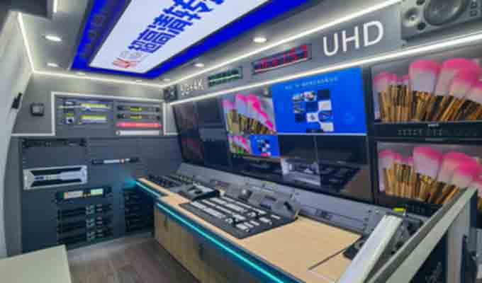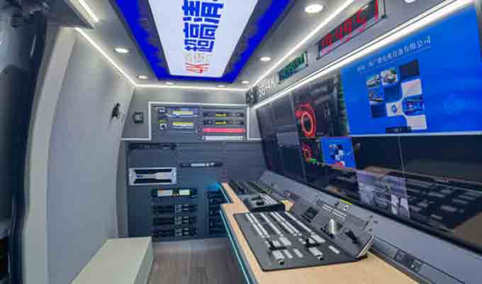 The onboard system integrates global broadcast gear: Sony 4K 3-chip cameras, BMD mixers, MIDAS/YAMAHA audio consoles, multi-screen monitors. It supports real-time camera switching, effects composition, HD recording, ensuring all video frames and sounds meet broadcast standards.