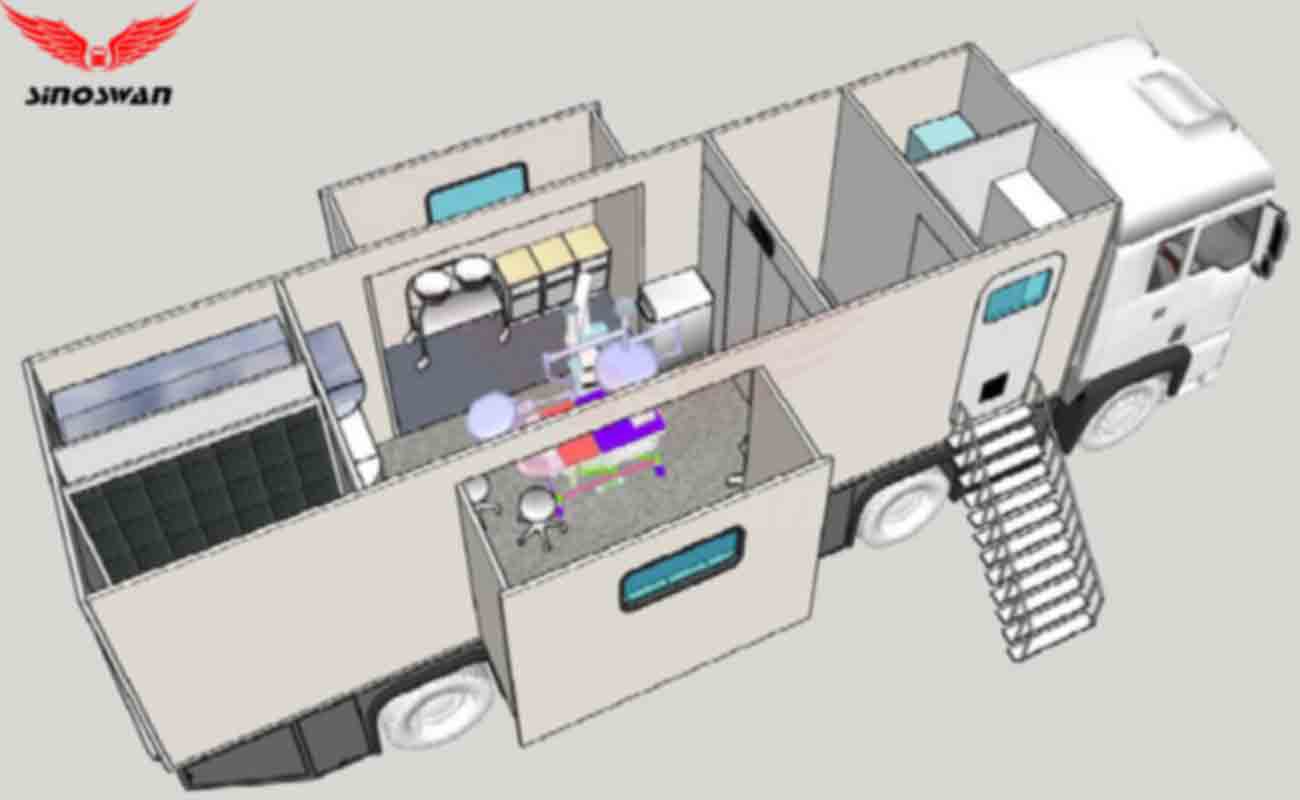 Sinoswan clinic vehicle is an integrated system, which combines vehicle cloud control system, vehicle heating and cooling air conditioning system, bilateral expansion structure, doctor-patient diversion design, 10,000-level purification system and independent power supply system.